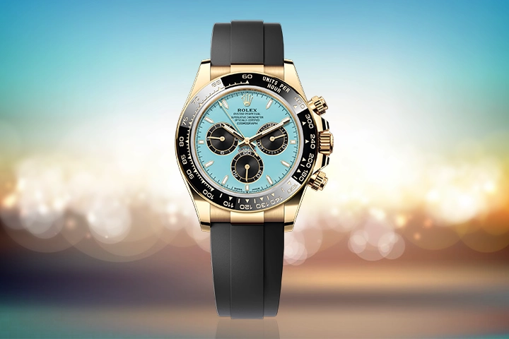 Rolex describes this dial as a magnificent Turquoise blue and black dial. The watch is paired with the rubber Oysterflex bracelet and makes a strong showing across all the models.