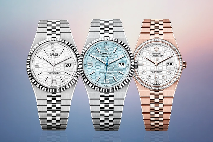 The Rolex Land-Dweller is available in two sizes—36mm and 40mm—and in three precious materials: Everose Gold, White Rolesor (steel and white gold), and 950 Platinum. The rose gold and white Rolesor models have a white dial, and the platinum model has an ice-blue dial, all with a beautiful honeycomb texture motif.