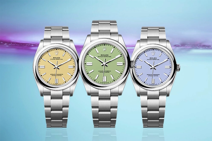 These new pastel additions offer a lighter, more relaxed, refreshing aesthetic for Rolex’s time-only model. Regarding movement, the OP 28 is powered by Calibre 2232, and the OP 36 and 41 are both run by Calibre 3230.