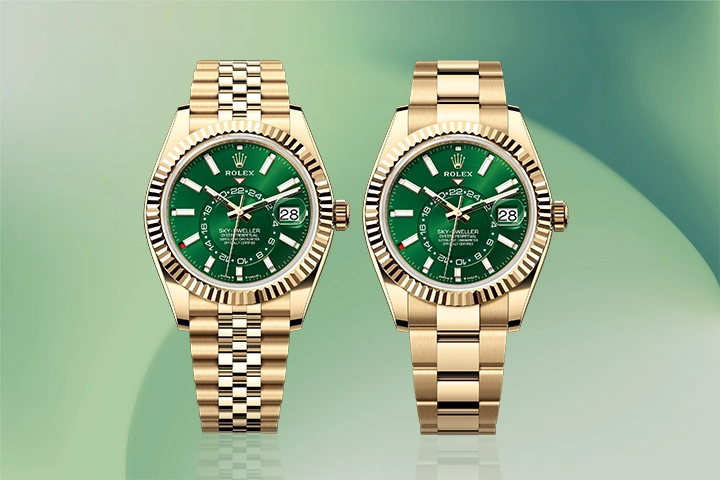 The Rolex Sky-Dweller's exceptional appearance is due to the radiance of the green dial and the fantastic reflection of the gold-fluted bezel and bracelet. The watch continues to offer The Crown's most complicated movement, with a Ring Command bezel and an annual calendar.